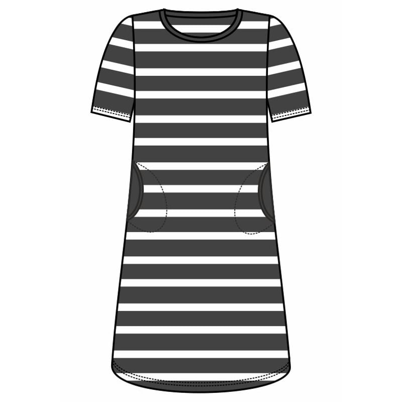 Mají volnější, mírně se rozšiřující střih, který je ve spodní části zakončený do jemného oblouku. Krátké rukávy jsou klasického střihu a oválný výstřih je úzce olemovaný. Šaty vynikají praktickými kapsami na bocích.