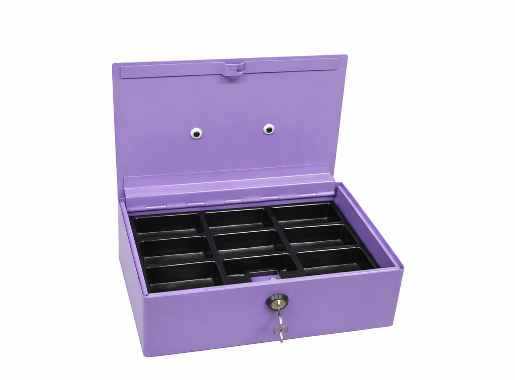 Bezpečnostní pokladnička na bankovky a mince – fialová, skladem Rozměry:Výška: 10,5 cmŠířka: 30 cmHloubka: 21 cmSkladem poslední kus.