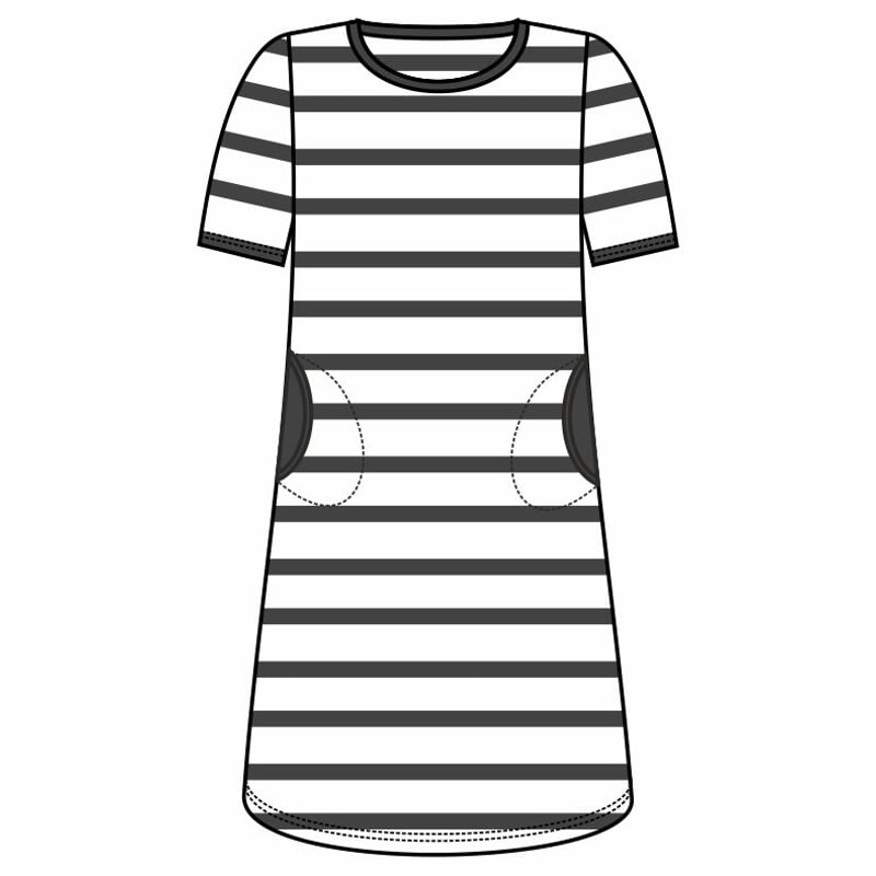 Mají volnější, mírně se rozšiřující střih, který je ve spodní části zakončený do jemného oblouku. Krátké rukávy jsou klasického střihu a oválný výstřih je úzce olemovaný. Šaty vynikají praktickými kapsami na bocích.
