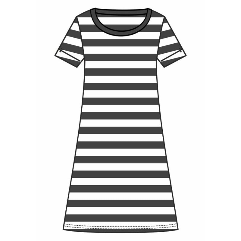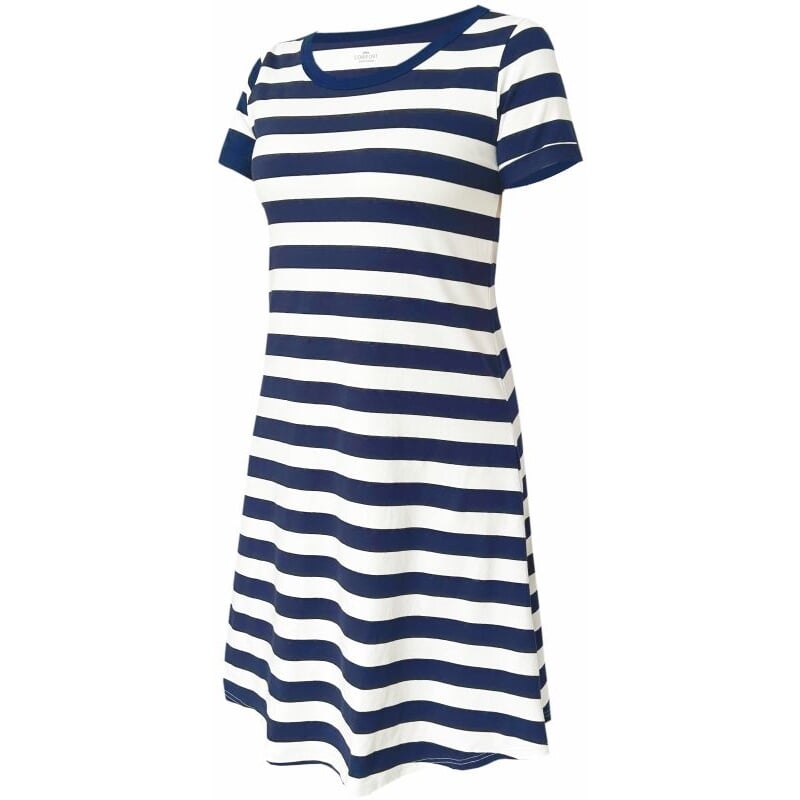 Dámské letní šaty v modrobílé pruhované kombinaci. Střihově se směrem dolů mírně rozšiřují, čímž lichotí postavě. Klasické krátké rukávy mají ozdobné ohrnutí a kulatý výstřih je lemován tmavě modrou barvou.