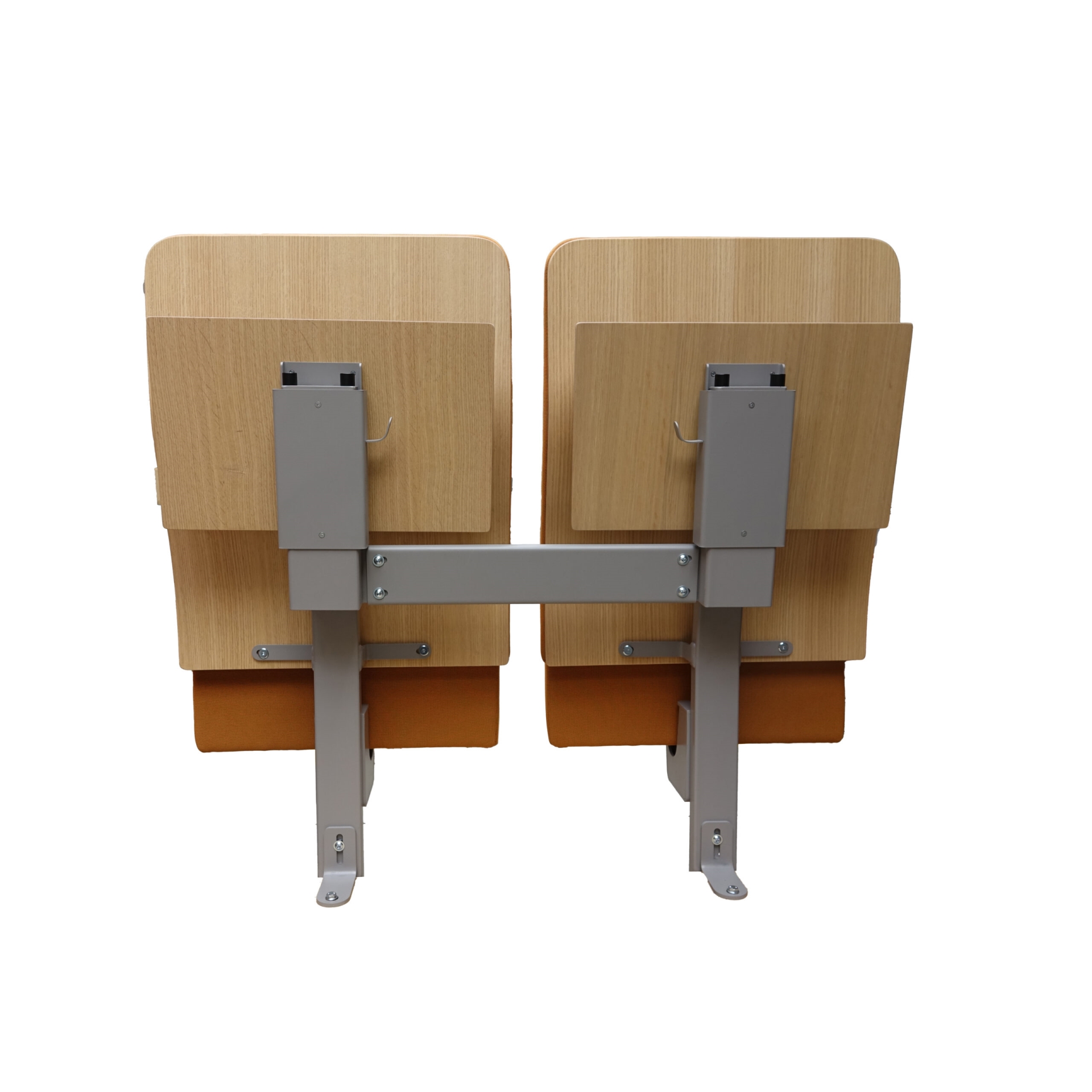 Základem sedačky je ocelová nosná konstrukce doplněná o prvky z masivního dřeva, které dodávají křeslu stabilitu i vizuální eleganci. Dřevěné plochy je možné povrchově upravit mořením nebo lakem v různých odstínech, aby ladily s architekturou konkrétního divadelního či koncertního sálu.