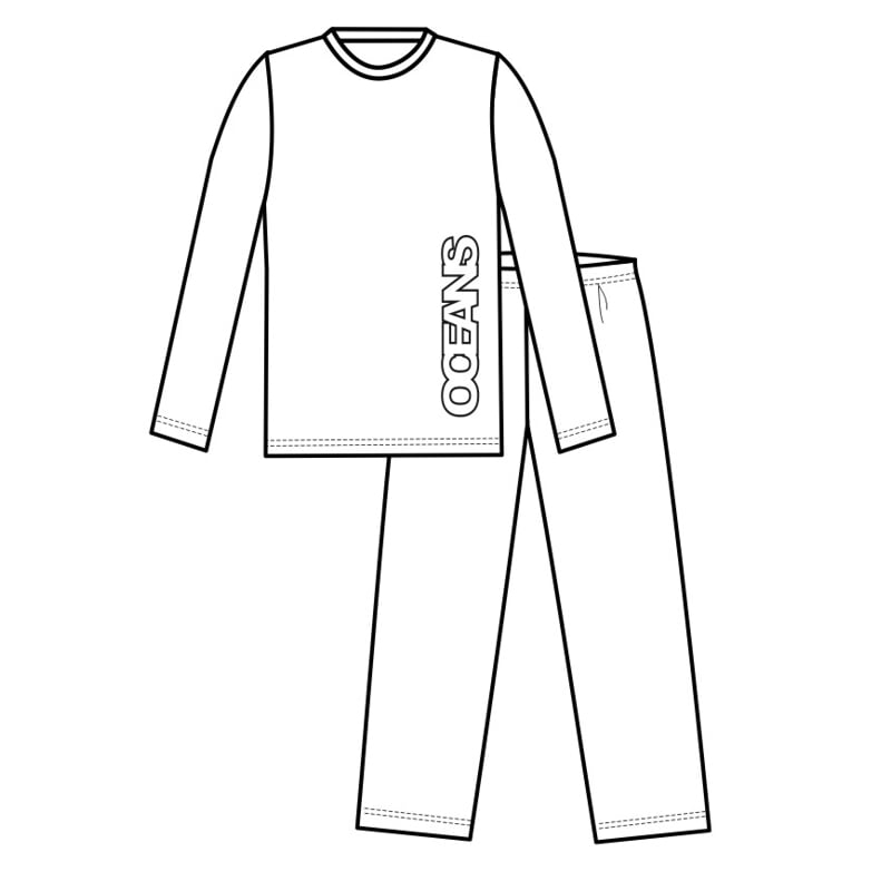 Funkční pánské pyžamo s dlouhými rukávy a nohavicemi. Tričko je rovného střihu, bez lemů a má kulatý výstřih olemovaný tmavší kontrastní barvou, shodnou s barvou kalhot. V téže barvě je na levém boku natištěný svislý nápis. Dlouhé kalhoty rovného střihu jsou tmavšího odstínu a mají pružný pas s možností regulace délky pruženky.