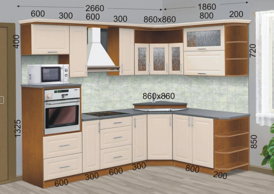 Kuchyň má velké množství úložného prostoru ve spodních i horních skříňkách. Pojezdy zásuvek jsou kovové - kolečkové, plynové zvedáky vodorovných dvířek s tlumením dovření. Kuchyňská linka má moderní úchytky. Skříňky jsou složené a zabalené, takže není potřeba je složitě skládat. Po dovozu stačí skříňky vybalit, ustavit a sešroubovat k sobě. Horní skříňky se věší na závěsnou lištu, která je součástí dodávky. Spotřebiče nejsou součástí. Kuchyňská linka stojí na stavěcích nožkách, které vyrovnají jakoukoliv nerovnost v místnosti.