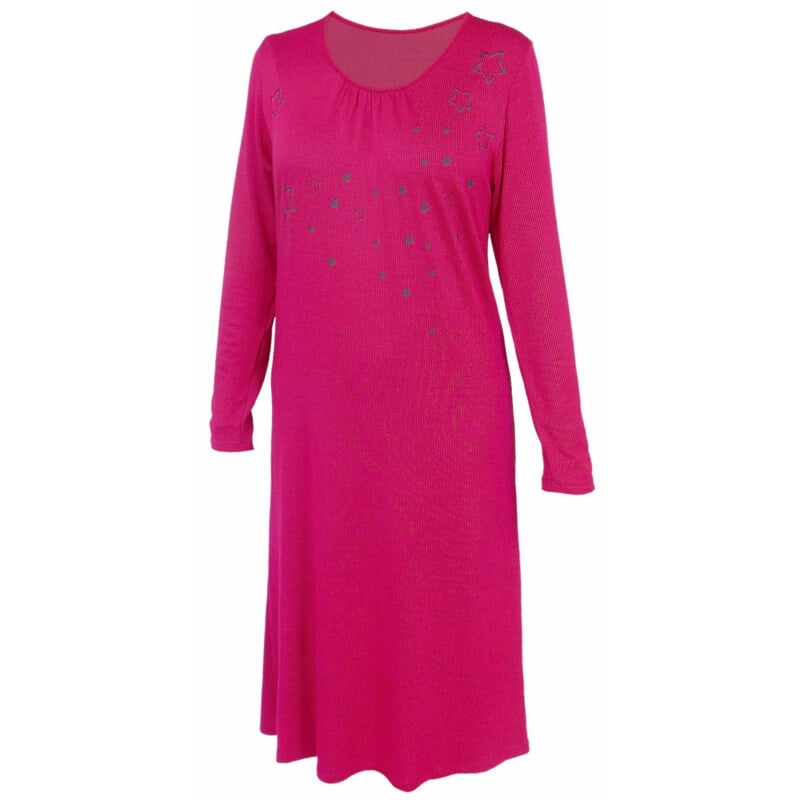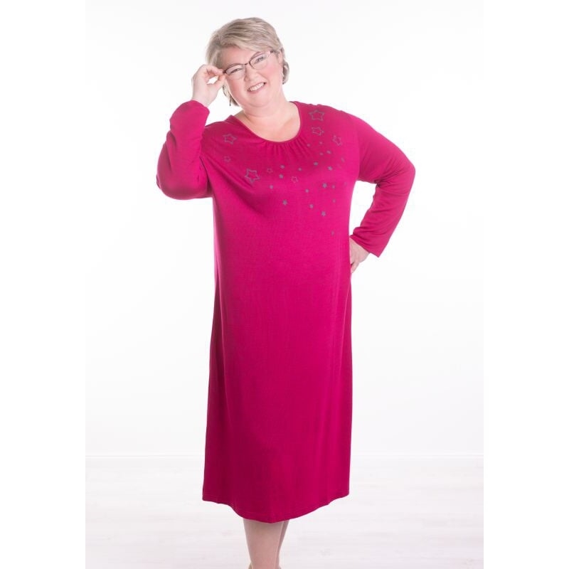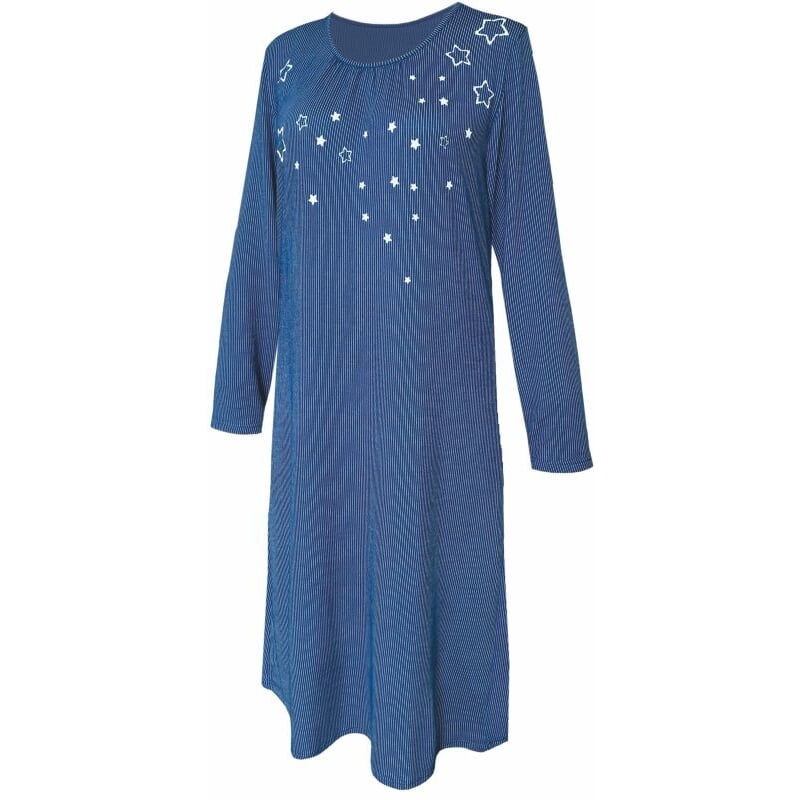 Funkční noční košile pro ženy. Dlouhé rukávy jsou klasického střihu, slušivý oválný výstřih je úzce olemovaný, s nařasením přes prsa. Na prsou je natištěný jemný hvězdičkový motiv.
