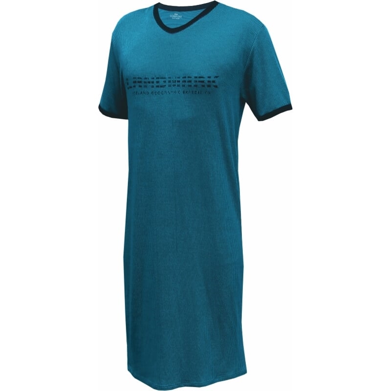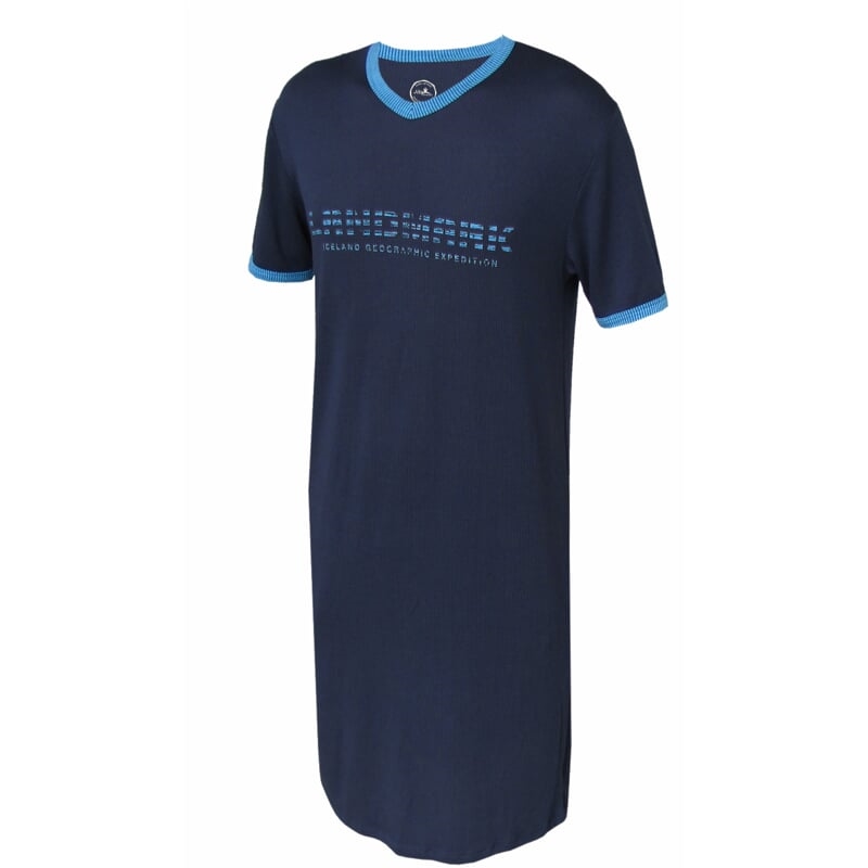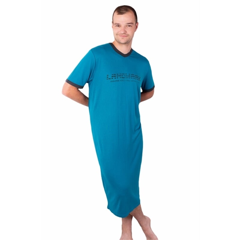 Funkční noční košile pro muže. S krátkými rukávy klasického střihu a špičatým výstřihem. Na prsou je natištěný decentní nápis v kontrastní barvě. Ve stejné barvě je lemovaný výstřih a rukávy.