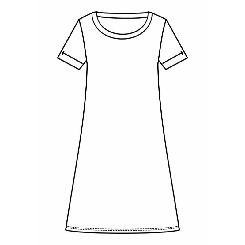 Jednoduché dámské letní šaty, směrem dolů mírně rozšířené, čímž lichotí postavě. Klasické krátké rukávy mají ozdobné ohrnutí a kulatý výstřih je olemovaný v barvě šatů.