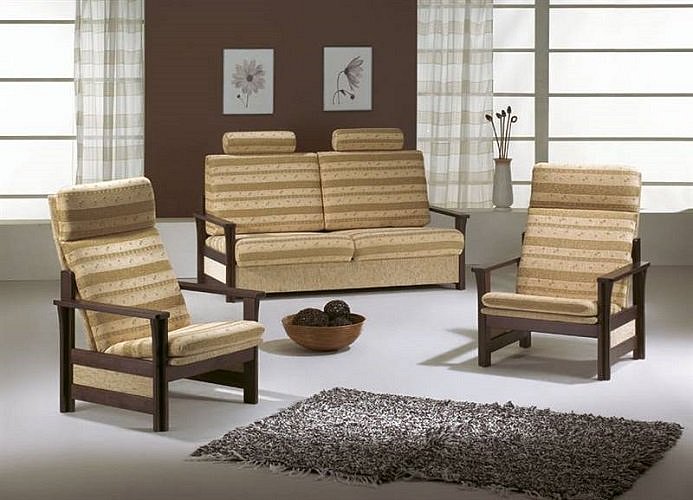 Klasická sedací souprava v kombinaci masivních bukových boků a čalouněných sedáků a opěráků. Vzhledem ke svým rozměrům je vhodná i do menších bytů. Nabízíme velký výběr v potahové látky. Opěráky jsou tvořeny z polyuretanových pěn, sedáky z polyuretanových a studených pěn a odpružení zajišťují vlnité pružiny. Díky bokům z masivního dřeva je zajištěna odolnost a stabilita křesla i pohovky a je zárukou dlouholetého využívání těchto čalouněných prvků bytového interiéru. Hodí se i do menších bytů. Na obou sedacích částech pohovky lze vsunout za opěrák vyvýšené polštářky pro zvýšení komfortu sezení. Sedací souprava se skládá z pohovky a dvou pevných křesel.