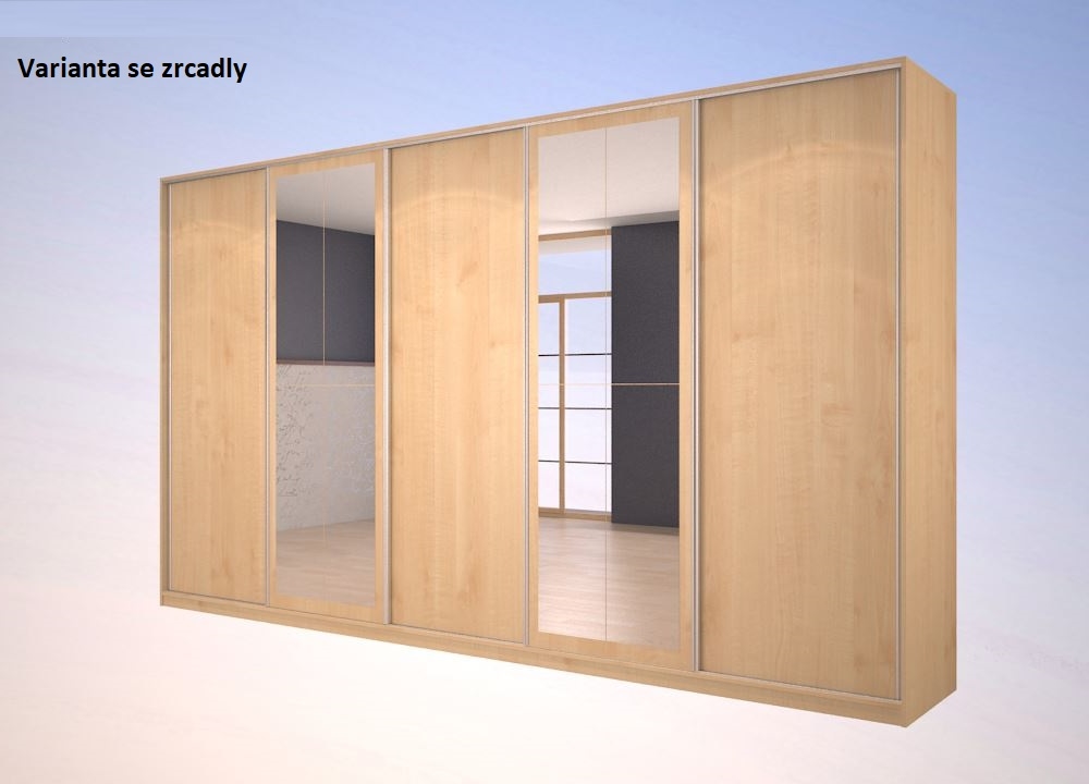 Kombinovaná skříň je rozdělena do pěti částí - tři šatní a dvě policové - lze upravit na přání zákazníka. Pro tuto skříň je charakteristické bezúchytové provedení, které sjednocuje design celé skříně. Krajní i prostřední dveře lze osadit děleným zrcadlem.