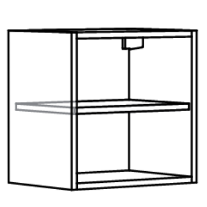 Otevřená horní skříňka s poličkou do kuchyně o výšce 45 cm Otevřená horní skříňka do kuchyně s poličkou, vyrobená z laminované dřevotřísky tloušťky 18 mm. Hrany korpusu jsou olepeny 0,5 mm ABS hranou. Záda jsou vyrobena ze 4 mm MDF desky. Barva zad není zcela identická s barvou korpusu. Horní skříňka je osazena