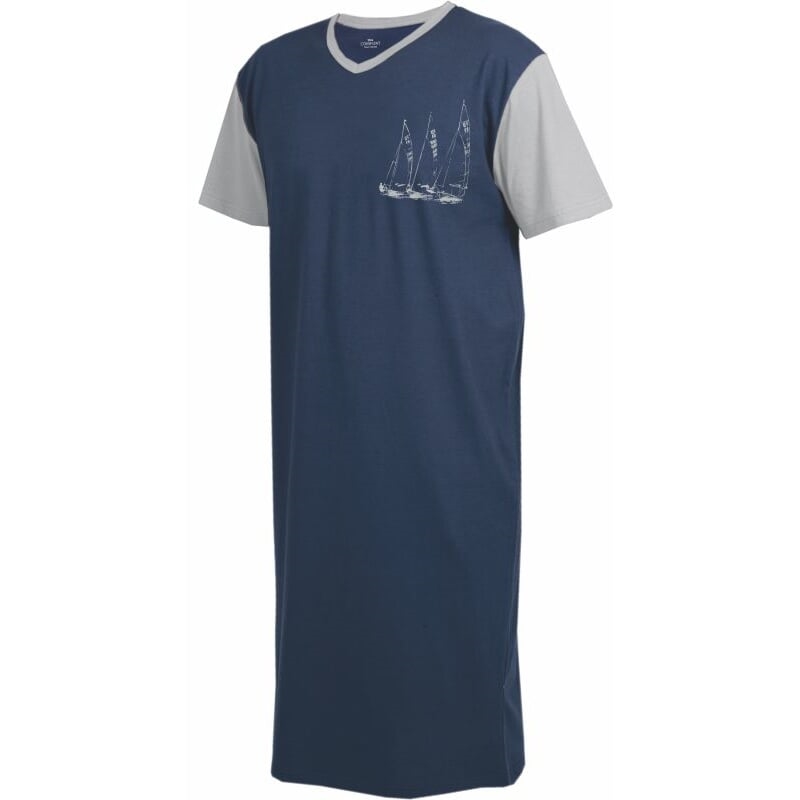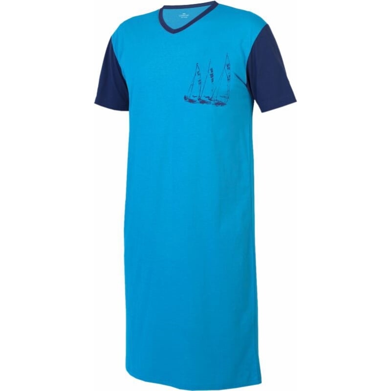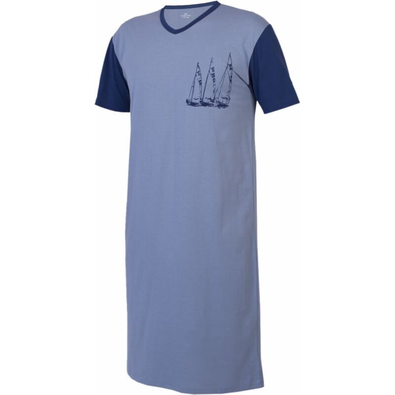 Pánská bavlněná noční košile. Dvoubarevná kombinace - krátké rukávy a lem u krku jsou v odlišné barvě, než je přední a zadní díl. Krátké rukávy jsou klasického střihu, špičatý výstřih je olemovaný. Na pravé straně prsou je natištěný motiv. V délce 111 cm pro velikost M, s odstupem 2 cm pro ostatní velikosti.