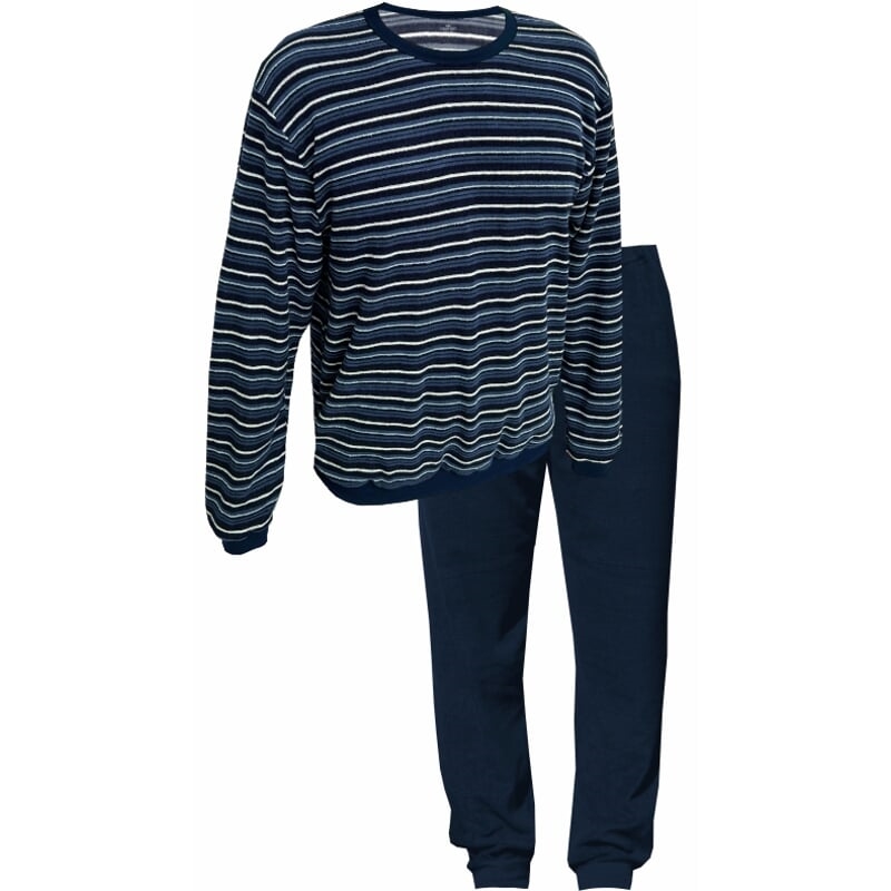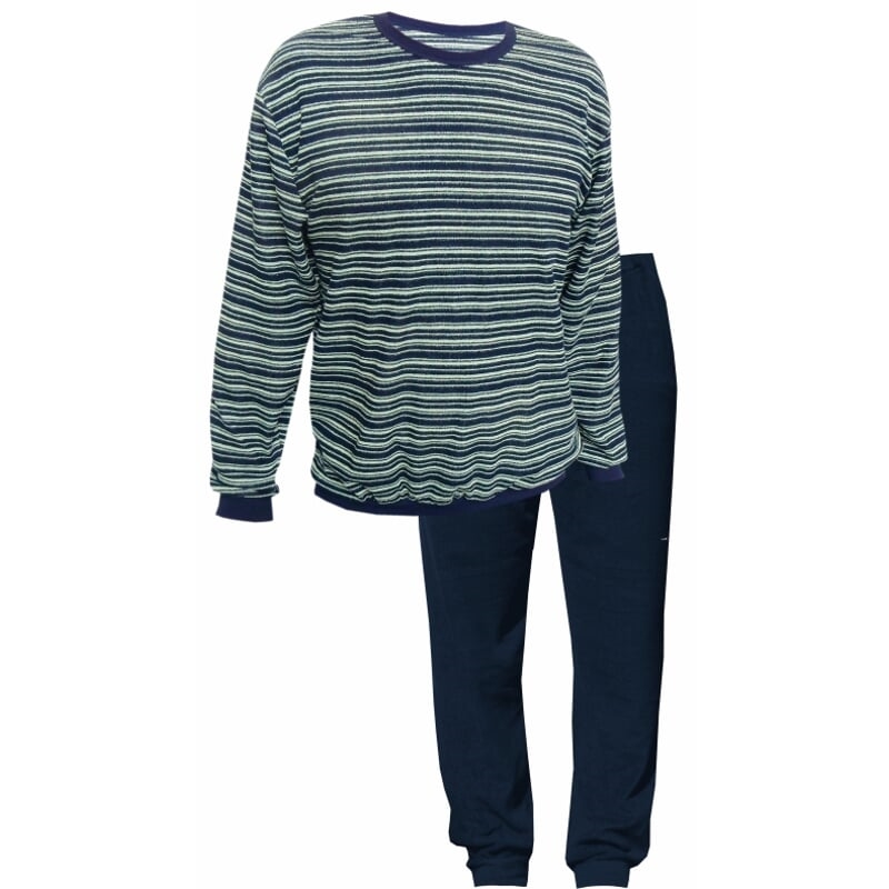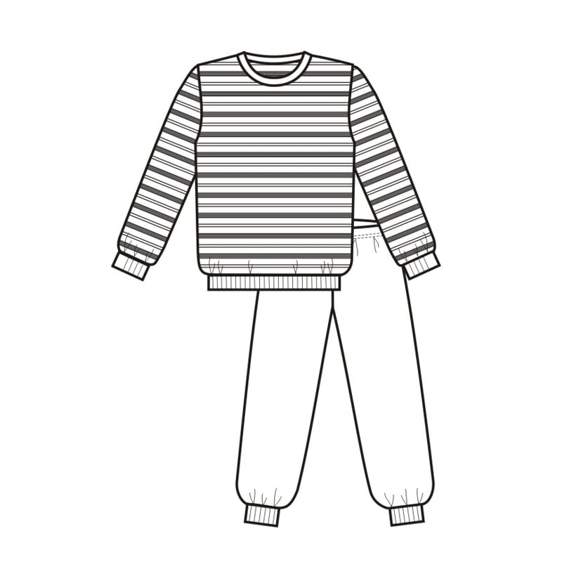 Pánské froté pyžamo s dlouhými rukávy a nohavicemi. Vrchní díl je ve slušivém dezénu tříbarevného proužku a má dolní okraj, rukávy i kulatý výstřih zpracované do pružných lemů v barvě kalhot. Dlouhé kalhoty jsou tmavé, s nohavicemi všitými do pružných lemů a mají pružný pas s možností regulace délky pruženky.