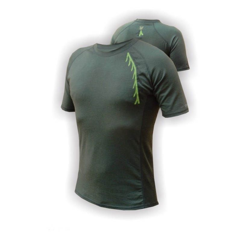 Pánské funkční tričko z merino vlny v designu určenému pro milovníky myslivosti. Kombinace hladkého úpletu a strukturovaného, se vzorem žebra, který je použit na pružné boční vsadky. S krátkými raglánovými rukávy a kulatým výstřihem. Technologie plochých švů v provedení do barvy materiálu. Zadní díl je prodloužený pro dokonalou ochranu zad. Potisky větviček v zelených odstínech jsou umístěny vlevo na prsou a vzadu za krkem. Hladký úplet obsahuje vlněnou přízi s jejími vynikajícími užitnými vlastnostmi v kombinaci s polyamidem, který zvyšuje tvarovou stabilitu a životnost úpletu. Složení: 96% vlna, 4% polyamid, gramáž - 185 g/m2.