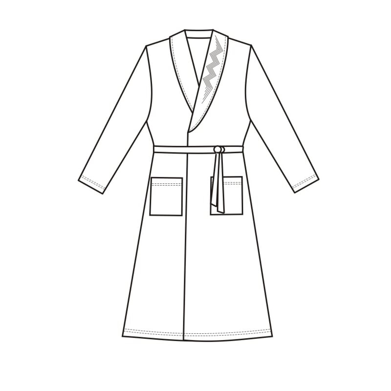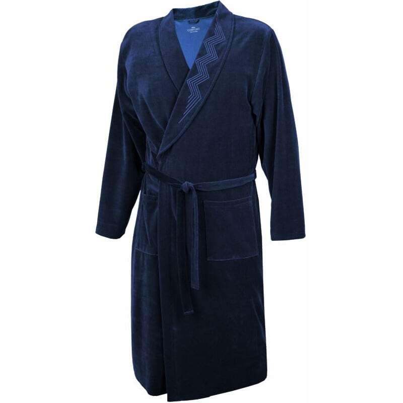 Plyšový pánský župan. Zavinovací střih, s páskem na převázání v pase, se šálovým límcem a velkými nakládanými kapsami. Šálový límec je na levé straně zdobený výraznou výšivkou.