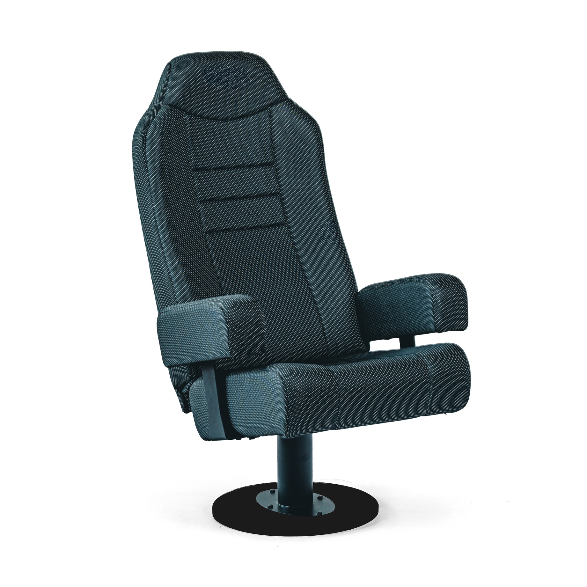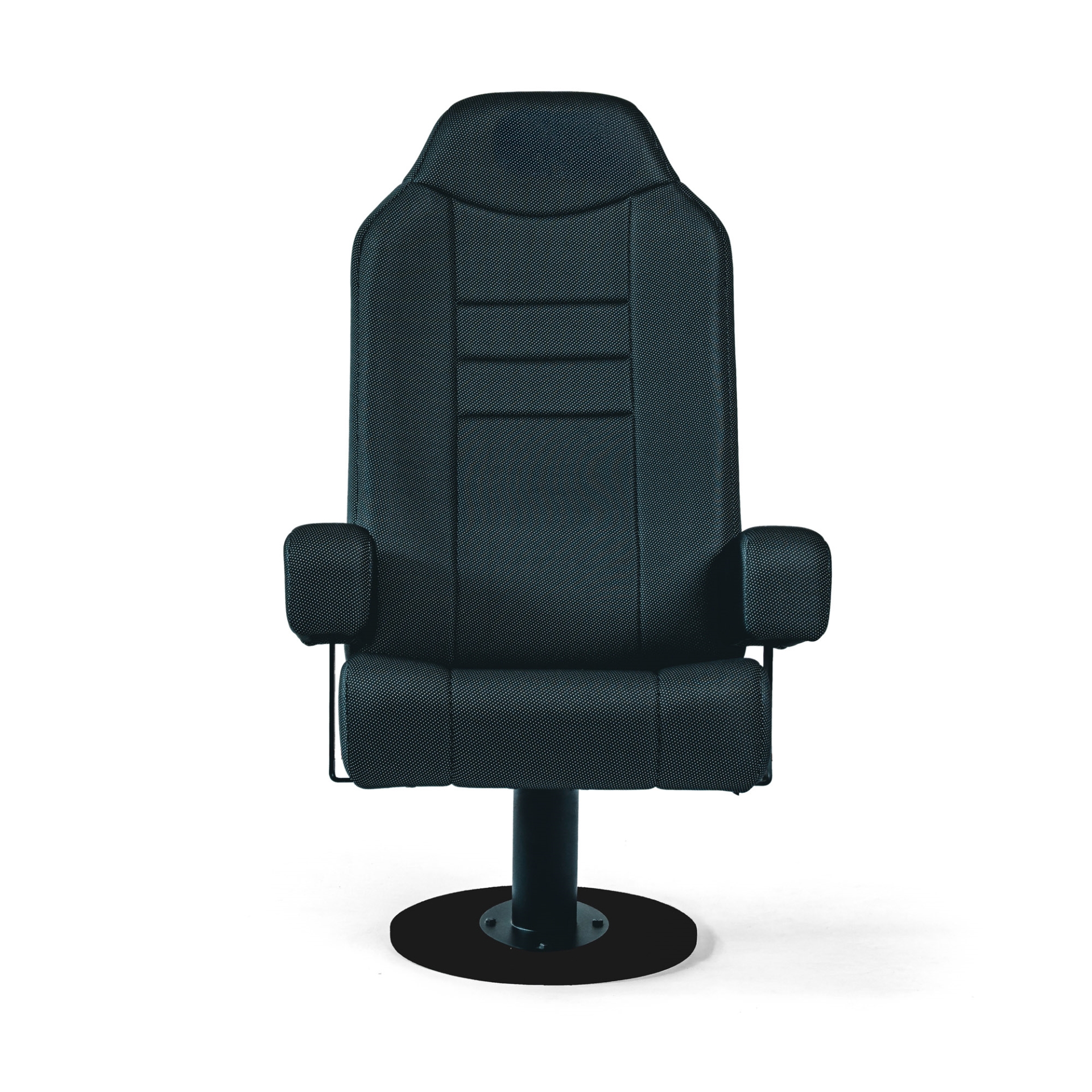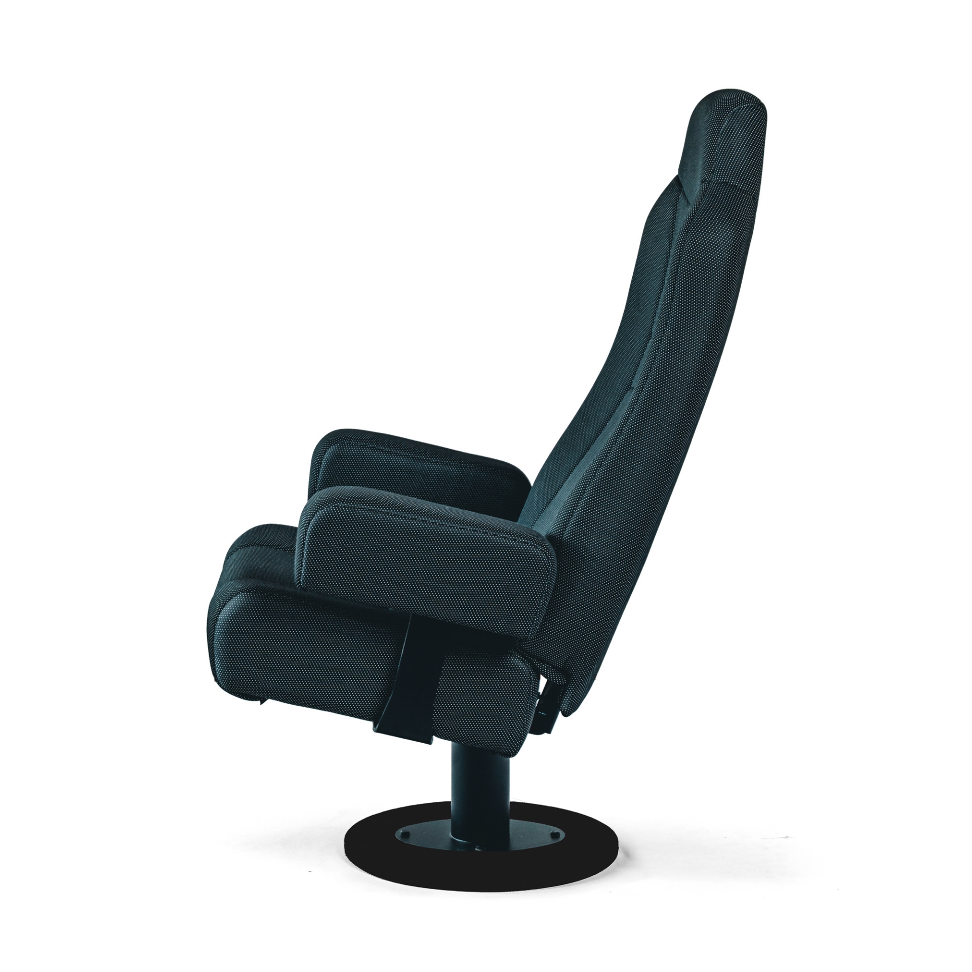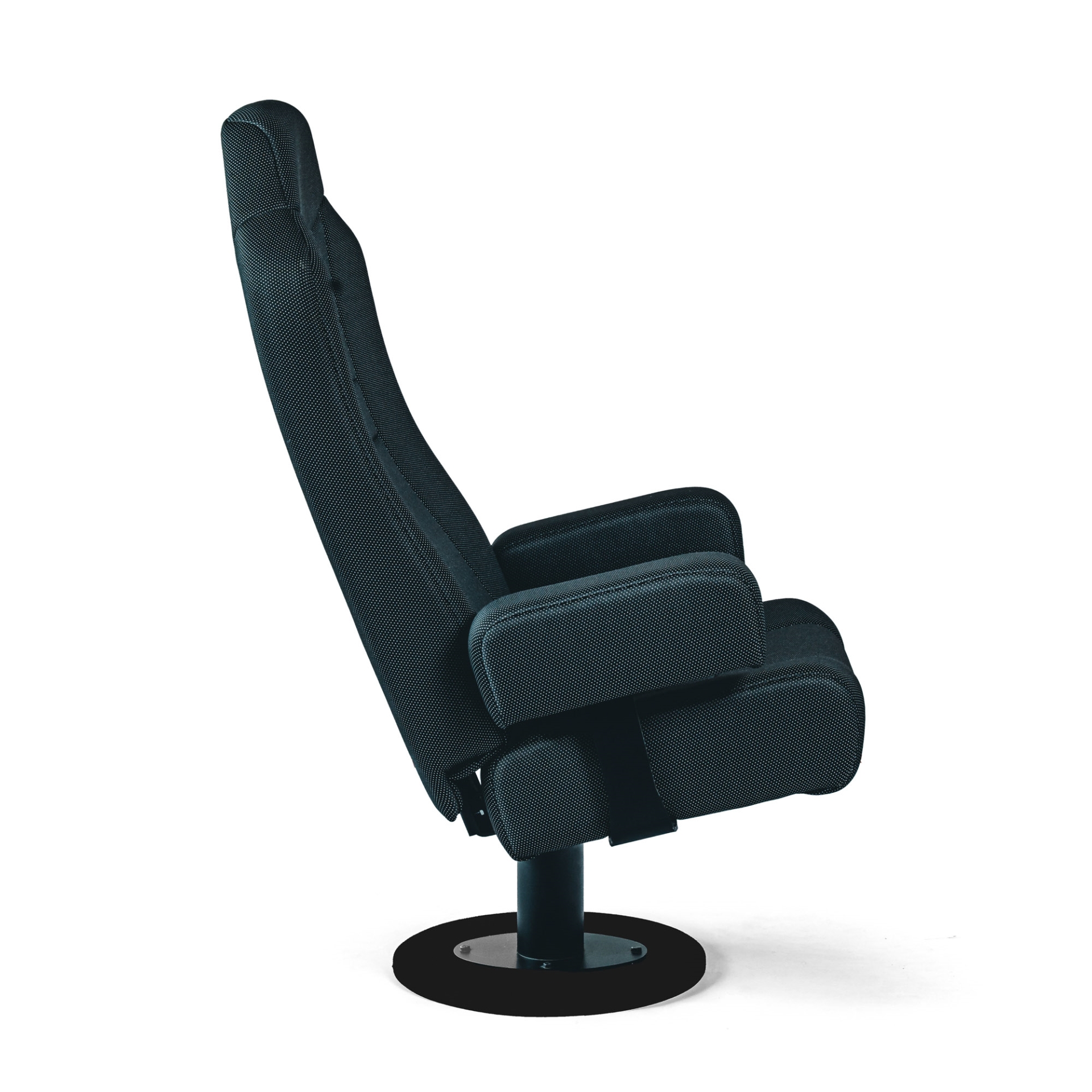 Konstrukce křesla vychází z ocelového nosného rámu na centrální nebo dvojité noze, doplněného o dřevěnou kostru, která zvyšuje pevnost a stabilitu křesla i při každodenním provozu. Ergonomicky tvarovaný sedák a čalouněný opěrák jsou vyplněny studenou pěnou s vysokou hustotou, takže si křeslo dlouhodobě drží tvar a poskytuje pohodlné sezení i při delší projekci.