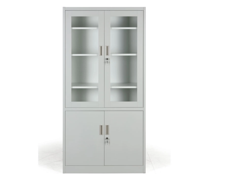 Prosklená uzamykatelná kovová policová skříň 185 x 90 x 40 cm kovová skříňka s dvojím typem dveří horní část skříně s prosklenými dveřmi, spodní s kovovými v prosklené... více