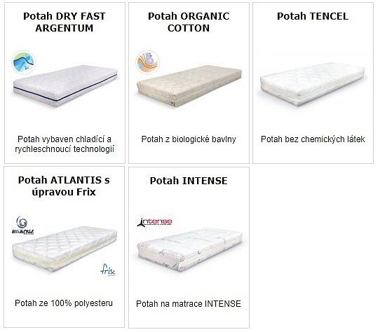 Potah - DryFast AG či Organic Cotton, možnost výměny za potah Intense, Tencel či Atlantis za příplatek.