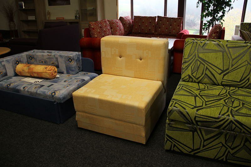 Celočalouněné rozkládací křeslo (přistýlka). Praktické a jednoduché polštářové rozkládání. Lehací plocha se vytvoří překlopením sedací a opěradlové matrace. Kostra křesla je tvořena z velkoplošných materiálů ( DTD ). Matrace z PUR pěny.