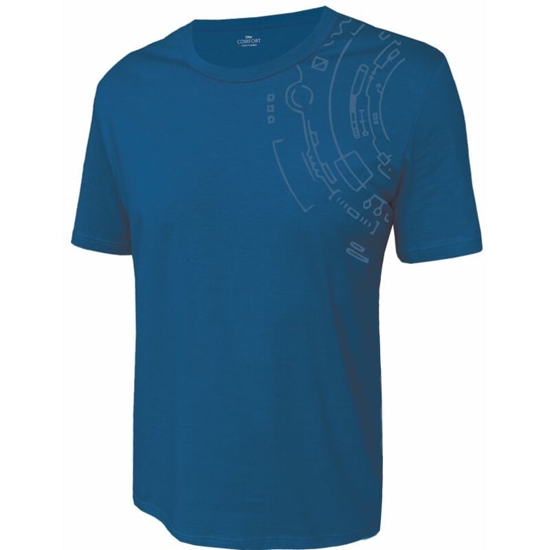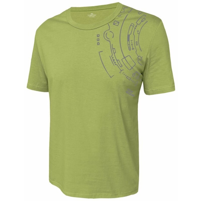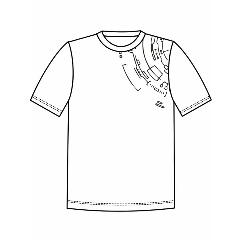 Pánské tričko klasického střihu s krátkými rukávy a kulatým výstřihem. Na levém rameni je natištěný jednobarevný motiv. Výstřih je olemovaný pružným materiálem.
