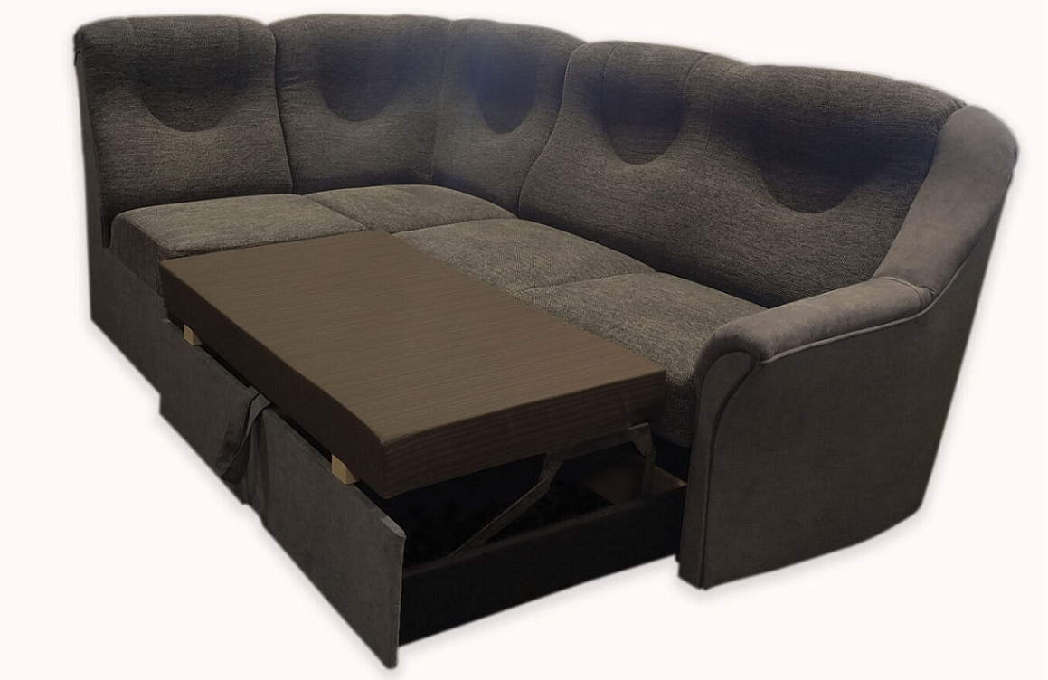 Luxus pohovky tkví v kombinaci pružin a pružinové matrace. Zdravotně tvarovaná bederní opěrka společně s výškou opěradla zaručuje pohodlný odpočinek. Na druhém obrázku je ilustrativně zobrazeno provedení rozkladu.